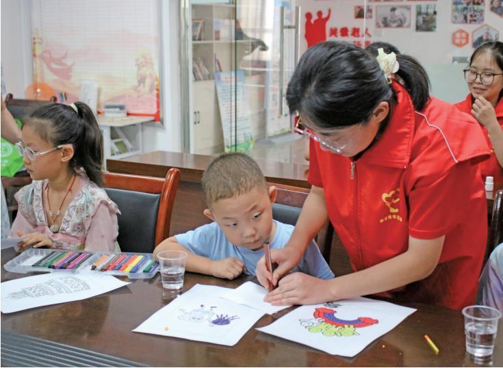 8月14日,在西安市临潼区骊山街道西大街社区“荧光童行”暑期公益课堂上,志愿者为孩子们上绘画课。