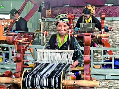 西藏山南市乃东民族哗叽手工编织专业合作社内,村民们正在编织纯手工的泽帖尔。本报记者 李丹阳摄/光明图片