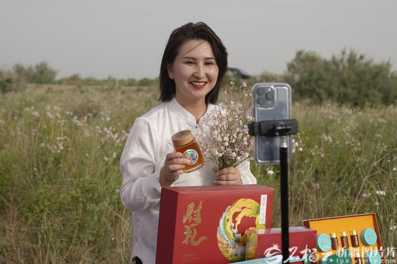 尉犁县直播基地主播走进田间地头,直播销售罗布麻花蜜。尉犁县直播基地供图