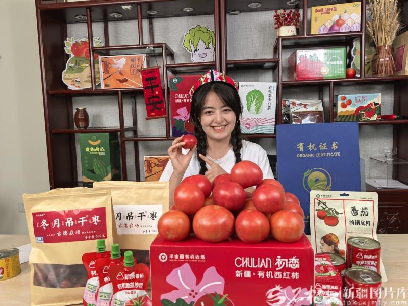 7月24日,库尔勒市电子商务双创孵化基地,一名主播在直播销售有机西红柿。石榴云/新疆日报记者 于江艳摄
