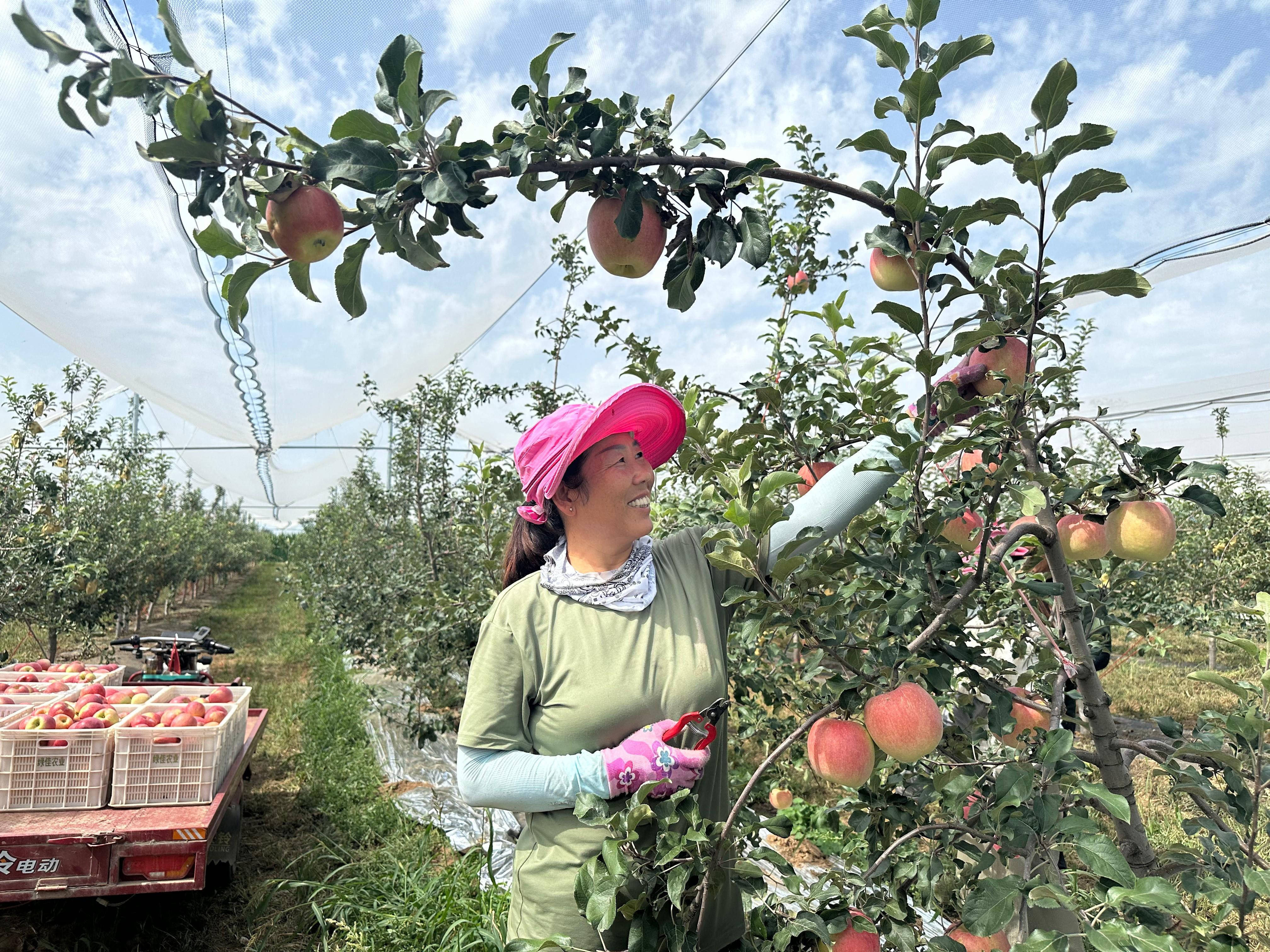 在基地的田间地头,一筐筐刚采摘下来的新鲜苹果整齐摆放,浓郁的果香随着微风扑面而来,沁人心脾。果农们穿梭在果树间,忙着采摘、分拣、装箱,还有工作人员在现场对接售卖事宜,每个人脸上都洋溢着丰收的喜悦,整个果园呈现出一派繁忙而繁荣的丰收景象。