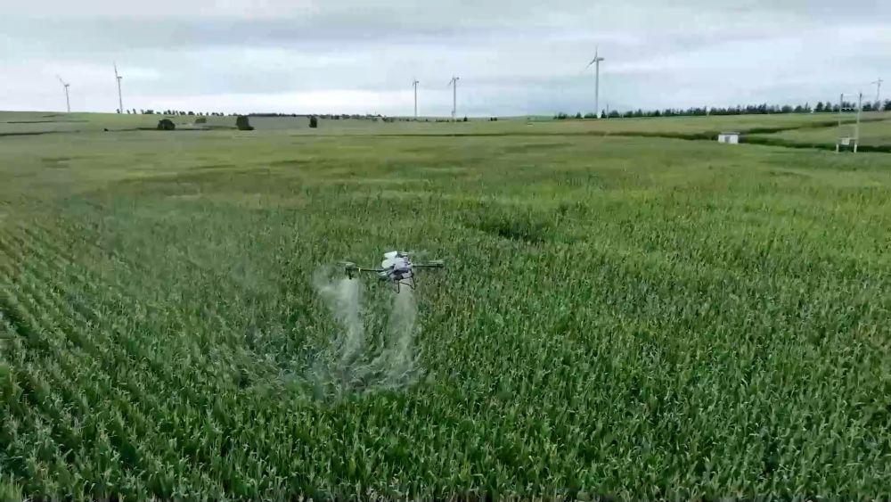 当前,正值玉米灌浆期。在内蒙古科尔沁右翼前旗察尔森镇水泉嘎查万亩高标准农田上空,装载农药的无人机正在沿着预设航线喷洒农药。