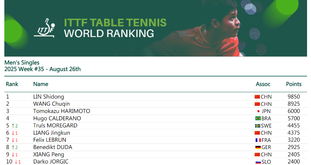 男单方面,国乒选手林诗栋和王楚钦占据前两位,身后是日本选手张本智和以及巴西运动员卡尔德拉诺。欧洲大满贯赛瑞典站冠军莫雷加德排名升至第五。排名第六至第十的分别是梁靖崑(中国)、费利克斯·勒布伦(法国)、杜达(德国)、向鹏(中国)、约奇克(斯洛文尼亚)。