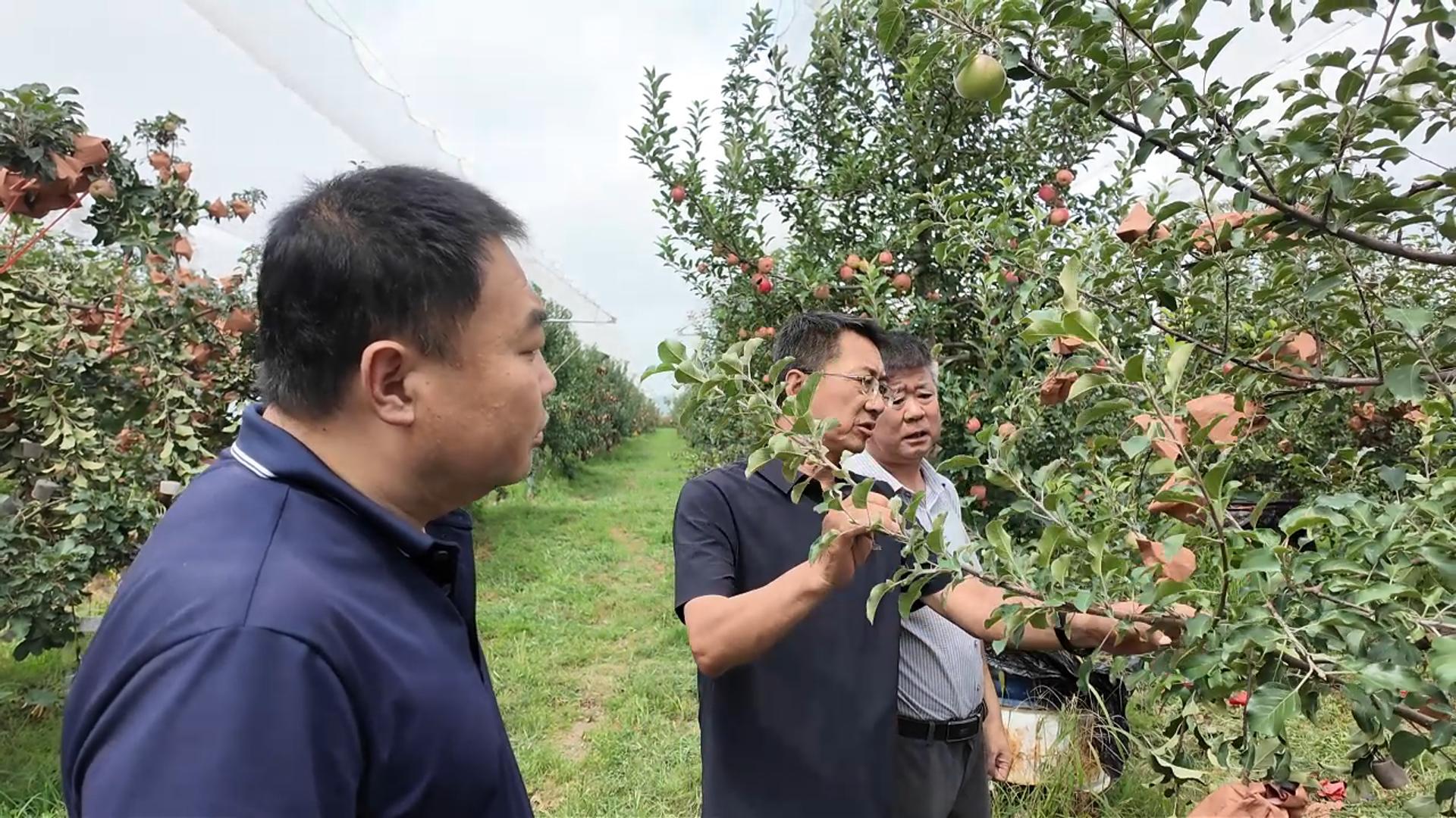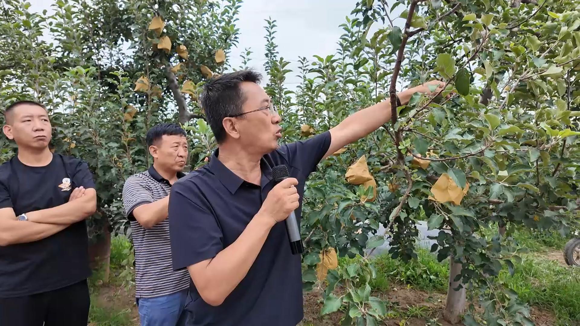 培训中,果农们围着刘光东不停提问,“果树叶子上长斑点咋治?”“啥时候给果子脱袋最合适?”面对大家的疑问,刘光东直接走到有问题的果树前,现场教大家辨认病害特征,手把手演示脱袋的正确手法和时机。从果园生草管理,果树拉枝技巧,到秋季施肥该挖多深的沟,怎么配药防治斑点落叶病,再到果子脱袋后的管护和采后预冷要点,他全程结合果园里的实际情况,把专业技术转化成“家常话”,听得果农们频频点头,不时掏出手机拍照记录,生怕漏了关键内容。