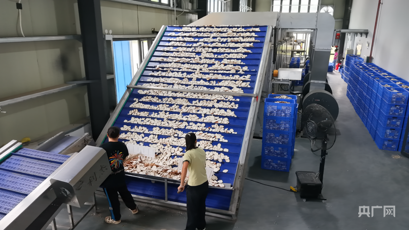 村民在加工车间将虎乳灵芝切片(央广网记者 付美斌 摄)