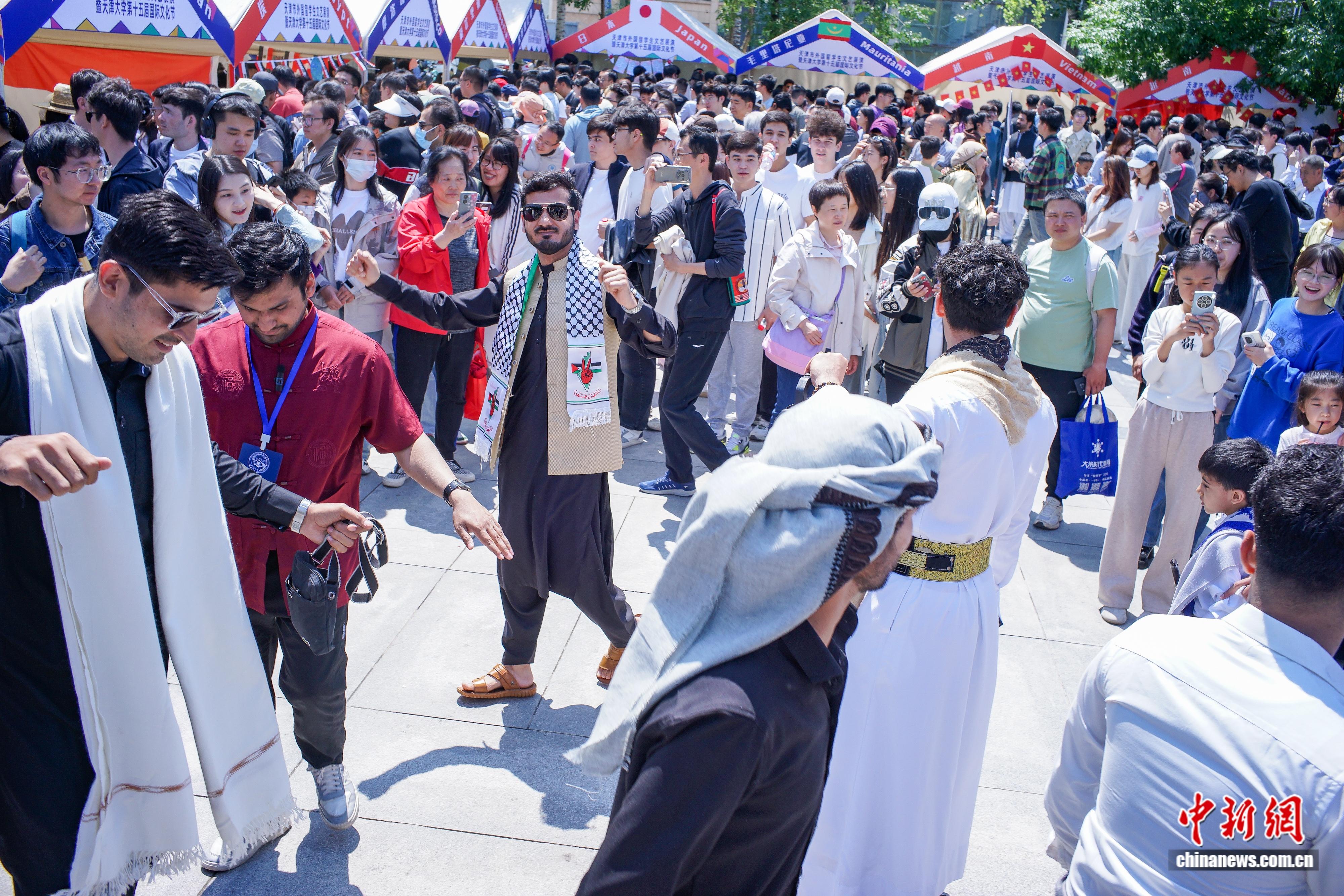 2025年5月10日,在“上合之约 津彩国际”天津市外国留学生文艺展演暨天津大学第十五届国际文化节上,来自也门留学生与参观者跳舞互动。中新社记者 佟郁 摄