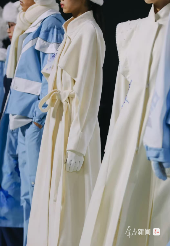 “我们希望以磅礴的秦晋文化向世界递出一张鲜明的名片,在材料上我们使用了TPU膜材质的服饰达到防水透湿的效果,然后在图案上我们将大雁塔的轮廓榆林的剪纸文化进行结合。”金奖作品《秦观跃动》设计师王莉雲说。