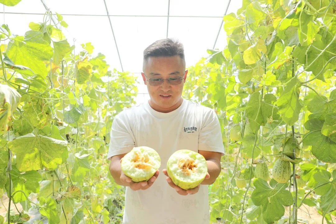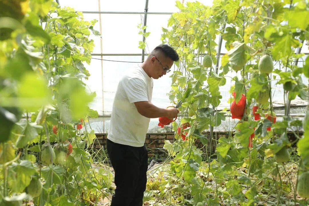 野目盖村不光有特色养殖业,更有设施蔬菜,让村民们在家门口实现增收。村内一座座标准化大棚整齐排列,从空中俯瞰蔚为壮观。走进野目盖村村民苏林平的大棚内,阵阵瓜香清甜诱人,甜瓜迎来丰收。苏林平忙着给甜瓜套网,动作娴熟而利落,网套将甜瓜包裹严实,既保护了甜瓜免受碰撞损伤,又为它们增添了一份精致。苏林平的种瓜技术成熟、销路通畅,他不仅把自己的产业做得红火,还主动分享经验、带动周边村民一起发展,助力大家增收致富。