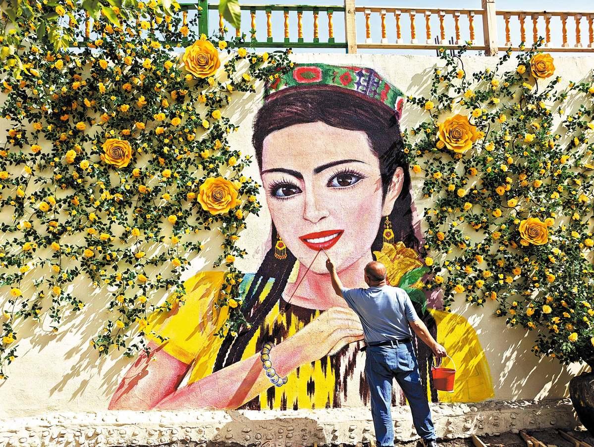 An artist works on a portrait in Awat county of Aksu in the Xinjiang Uygur autonomous region on July 18, 2025. The county is using art to promote local culture and tourism. [Photo by Bao Liangting/For China Daily]