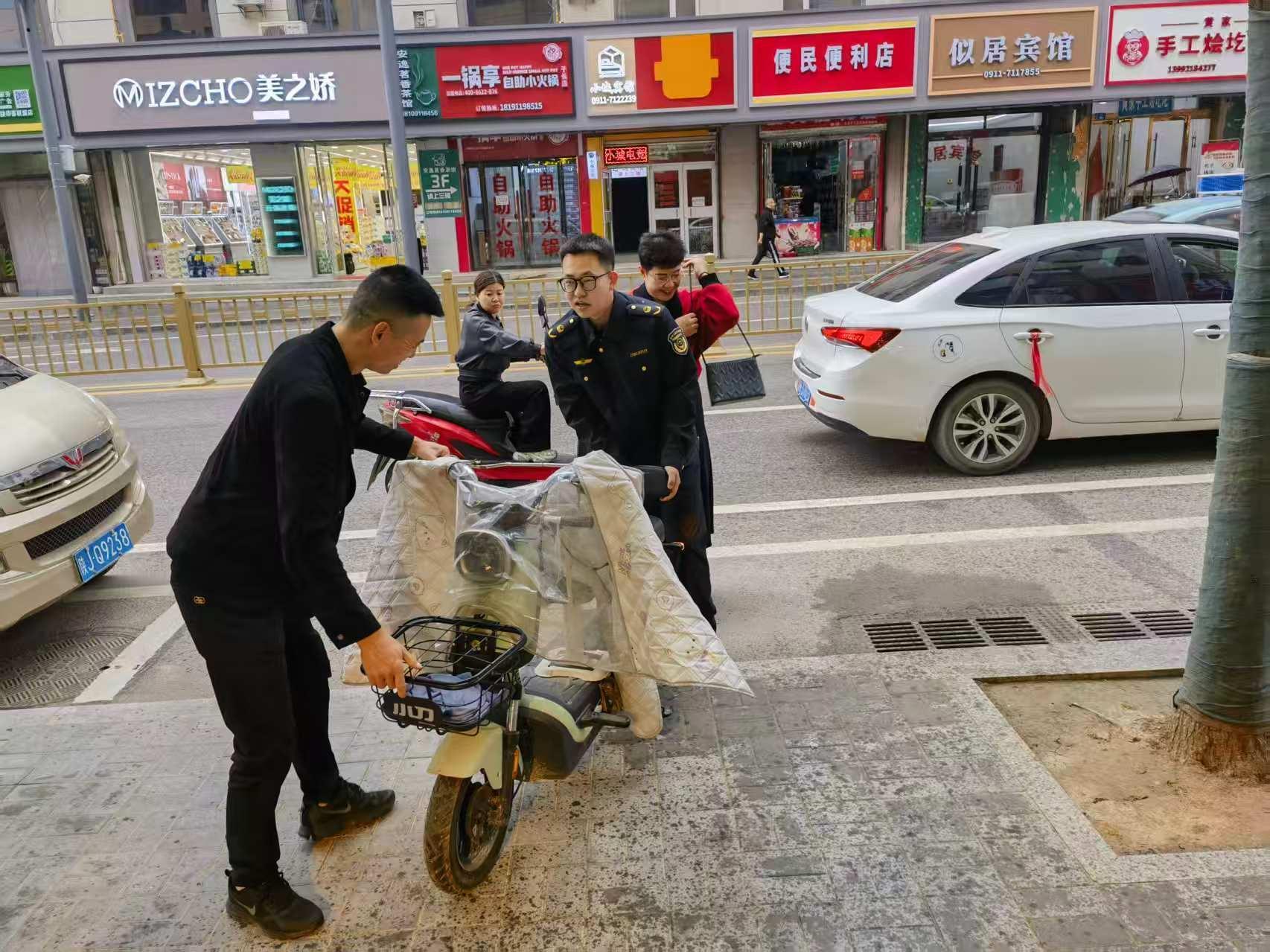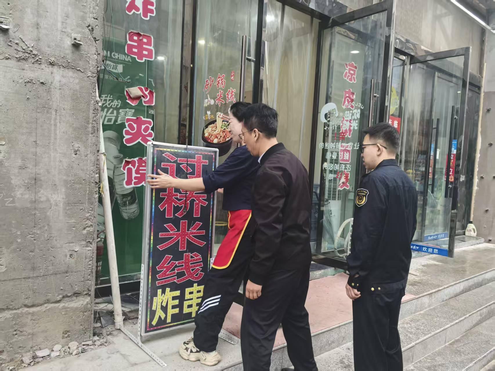 沿街商铺前,同样活跃着志愿者忙碌的身影。他们主动上前,协助商户将店外摆放的商品搬运至室内,耐心宣讲“门前四包”责任制,劝导商户杜绝出店经营、占道摆放,共同维护整洁、有序的市容环境。“下雨天你们还在忙,真是太辛苦了!我们一定配合好,不乱摆乱放。”一位店铺老板感动地说着,连忙和志愿者一起整理货品。