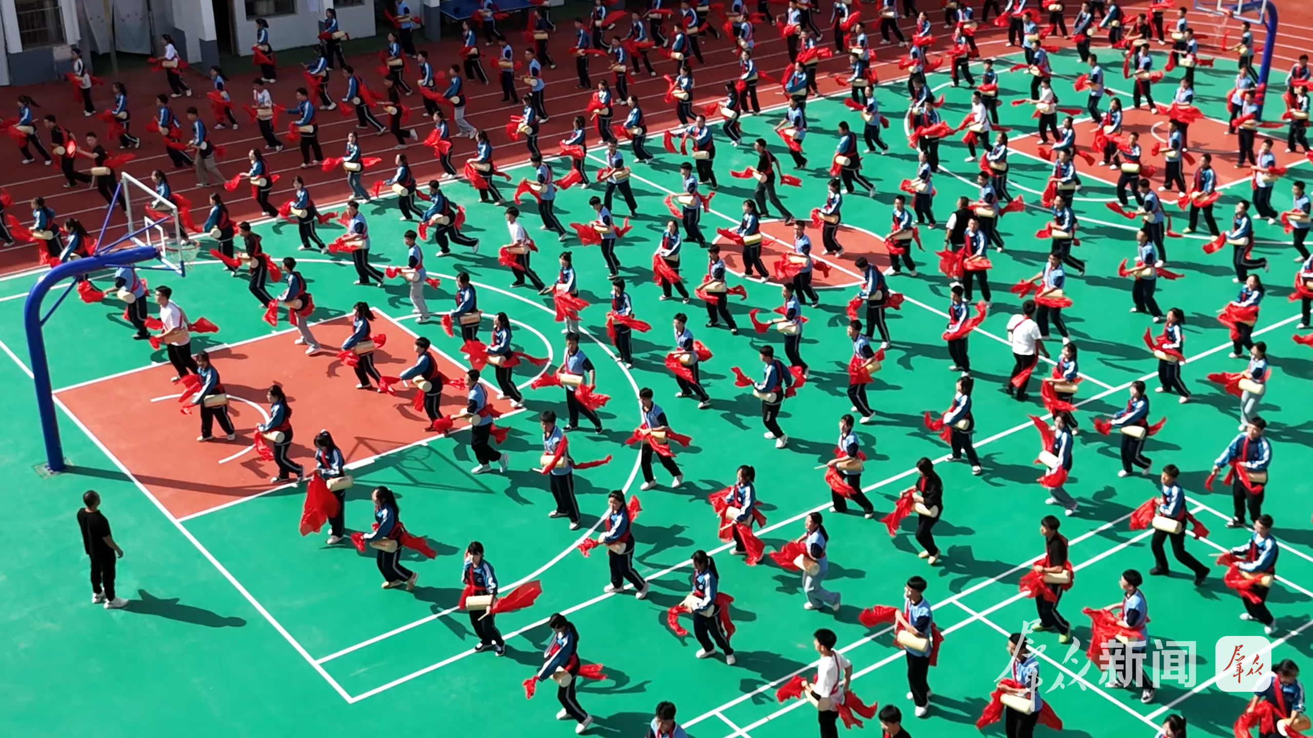 为了全面展示半年来的课间操训练成果,近日,榆林市横山区十余所中小学的5000余名学生,正利用课余时间紧张排练。他们红绸翻飞、鼓槌起落,每一个动作都凝聚着汗水与专注,这是横山区将国家级非遗“横山老腰鼓”深度融入教育体系的生动成果展现。这不仅是对传统艺术规模的突破,更是文化基因在新一代心中扎根的深刻实践。