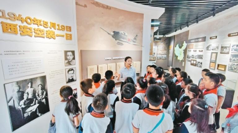 工作人员给学生们讲解“共卫山河——西安军民抗战纪事”专题展览。 (记者窦翊明 摄)
