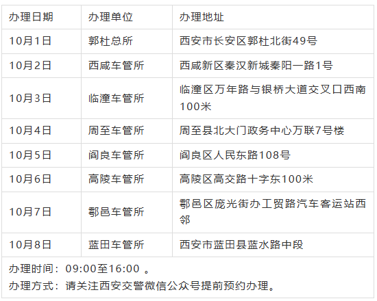 国庆中秋假期,请广大市民朋友们根据服务时间前往办理相关业务。西安公安交警将为您竭诚服务!