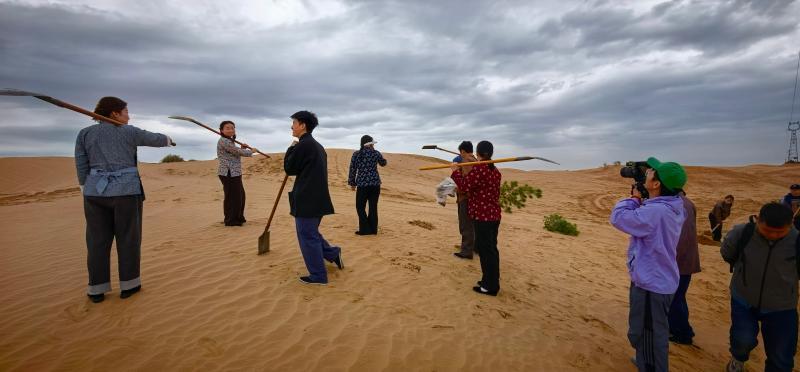 此次摄制组选址靖边,正是看中当地“大漠与绿洲共生”的独特地貌,以及“治沙造林”背后蕴含的奋斗精神——这与省冬运会倡导的“挑战自我、奋勇拼搏”理念高度契合。当天清晨,摄制组便在靖边沙漠公园搭建场景,工作人员细致调试设备、布置道具。演员们则换上80年代风格的朴素工装,深蓝色劳动布褂子、旧布鞋搭配白头巾,瞬间将时光拉回数十年前:在沙丘连绵的背景下,演员们手持铁锹、肩扛树苗,或弯腰挖坑、或扶苗培土、或提桶浇水,动作娴熟自然,生动还原了先辈们在荒漠中攻坚克难、播种绿色的珍贵场景。