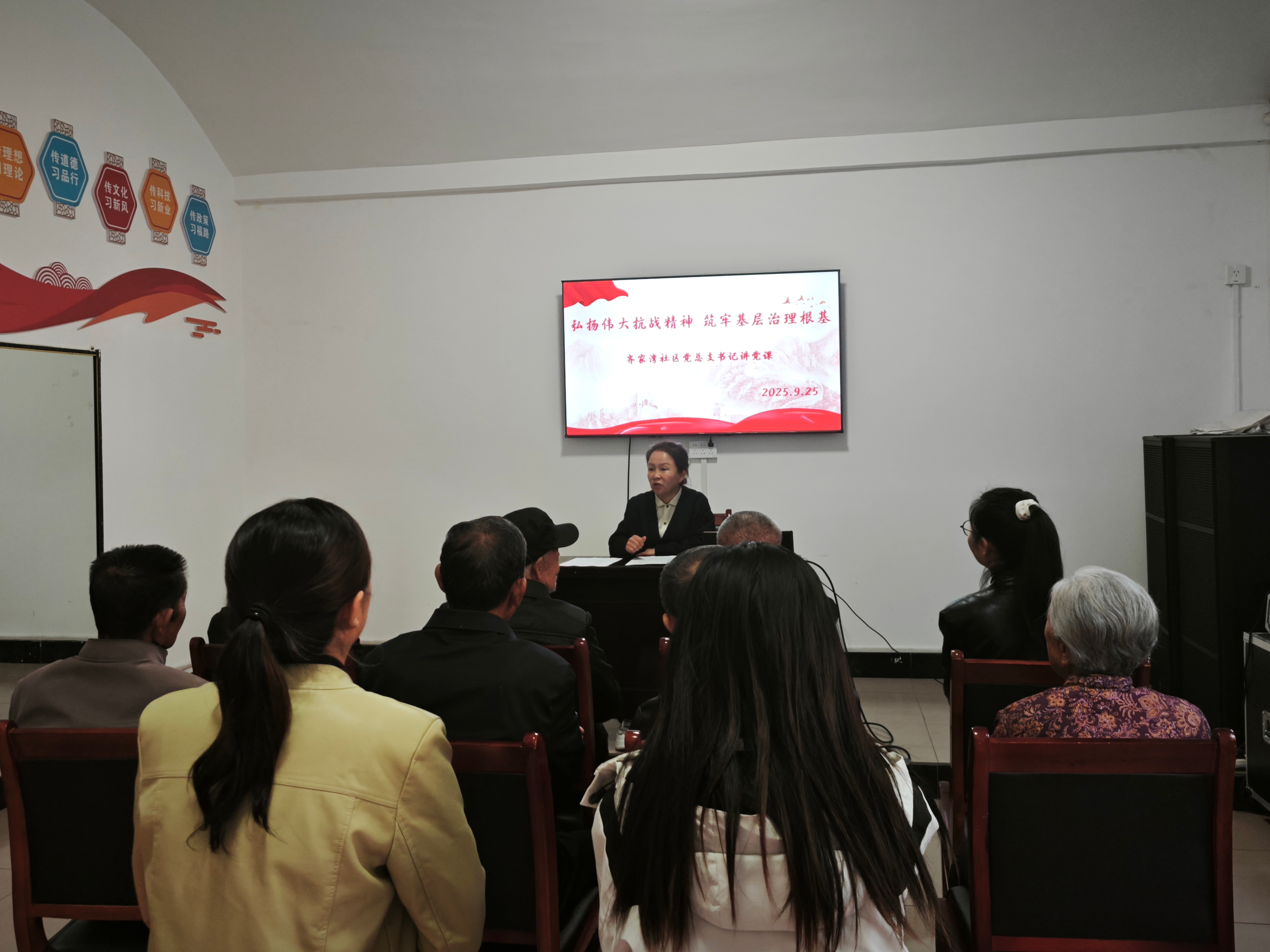 社区党总支书记石艳艳以《弘扬伟大抗战精神 筑牢基层治理根基》为题讲授专题党课。她通过回顾峥嵘抗战历史,深入解读抗战精神核心内涵,同时结合社区服务群众、化解矛盾等实际工作,为党员践行精神内核、发挥模范带头作用明确方向。老党员们分享了自己的思考和感悟,并围绕“党建引领社区治理”核心议题,聚焦民生痛点、难点问题积极建言,围绕优化养老服务、提升环境品质、丰富文化活动、完善便民设施等方面,提出意见建议10余条。