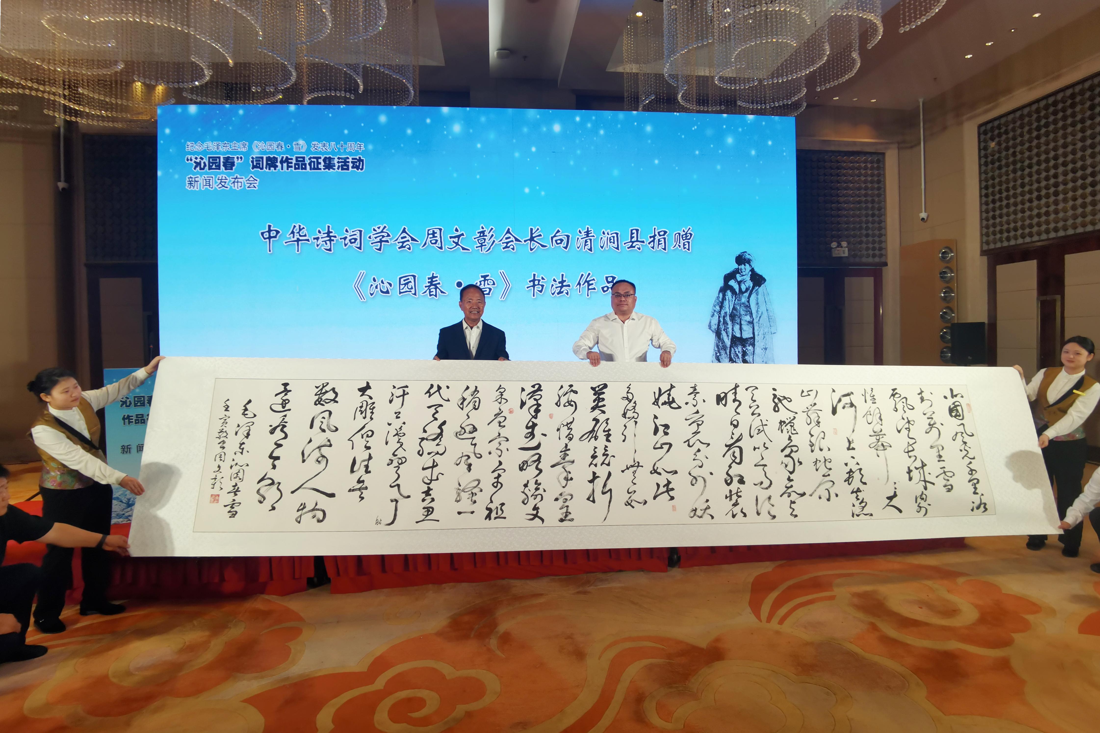 会上同步宣读《“沁园春”词牌作品征集启事》,播放清涧县专题宣传片,并举行《沁园春·雪》书法作品捐赠仪式。著名朗诵家现场共读《沁园春·雪》,重温“北国风光,千里冰封”的壮美意境,再现“数风流人物,还看今朝”的豪迈情怀。