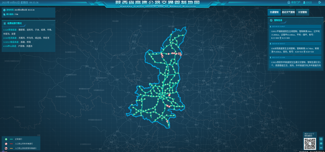 3.接交警通知,麟绛高速麟法段九成宫收费站入口临时管控。4.因施工,宝鸡过境高速宝鸡西收费站入口003车道、出口104车道临时管控。