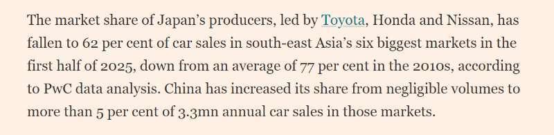 英国《金融时报》日前聚焦了中国电动汽车在东南亚市场的快速发展。报道指出,中国平价电动汽车销量的飙升,打破了日本汽车制造商数十年来对东南亚市场的垄断。报道援引普华永道的数据分析指出,2025年上半年,以丰田、本田和日产为首的日本汽车制造商在东南亚六大市场汽车销量中的份额已从21世纪10年代的平均77%降至62%,而中国在这些市场中的份额则从微不足道上升至5%以上。