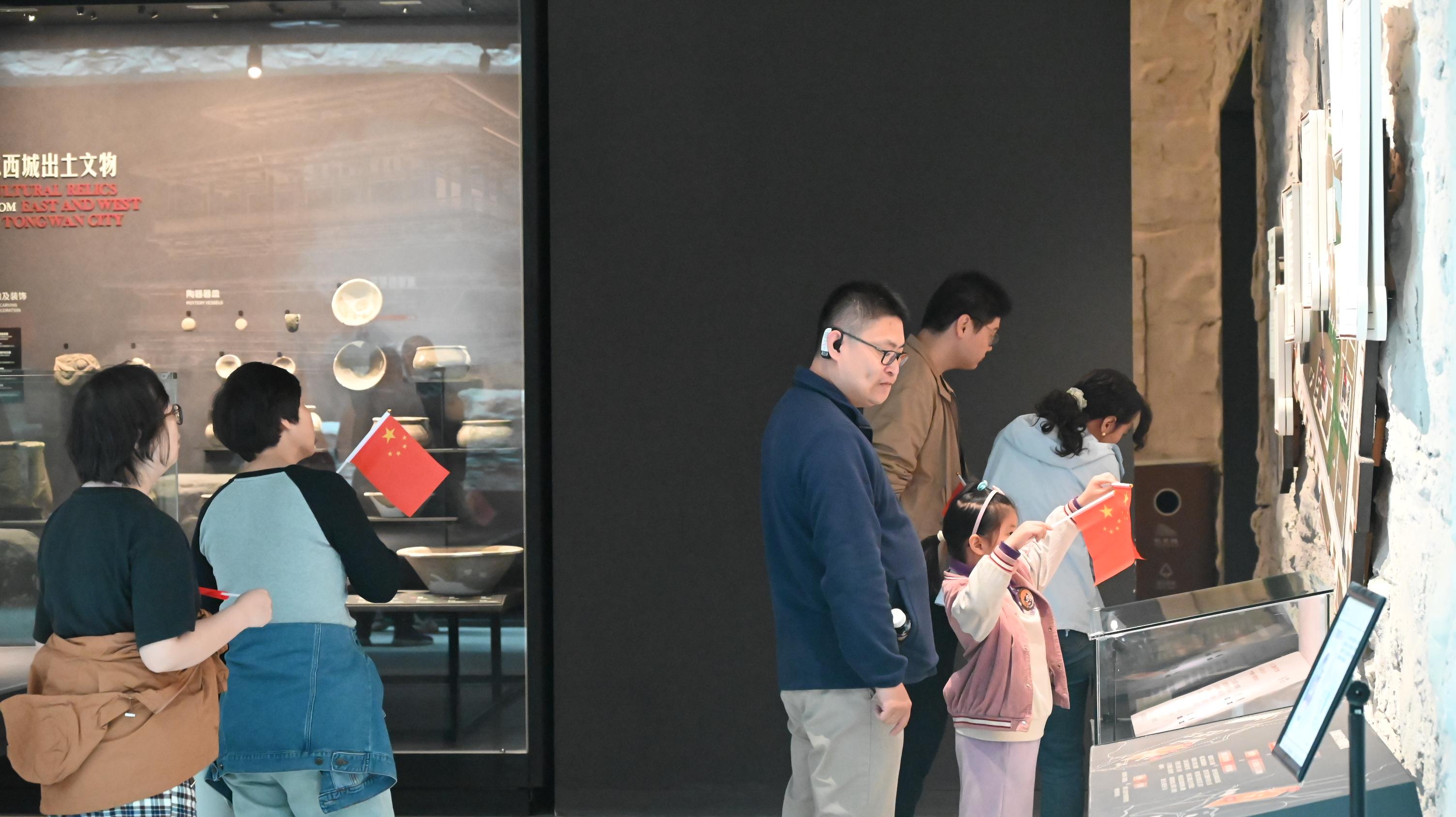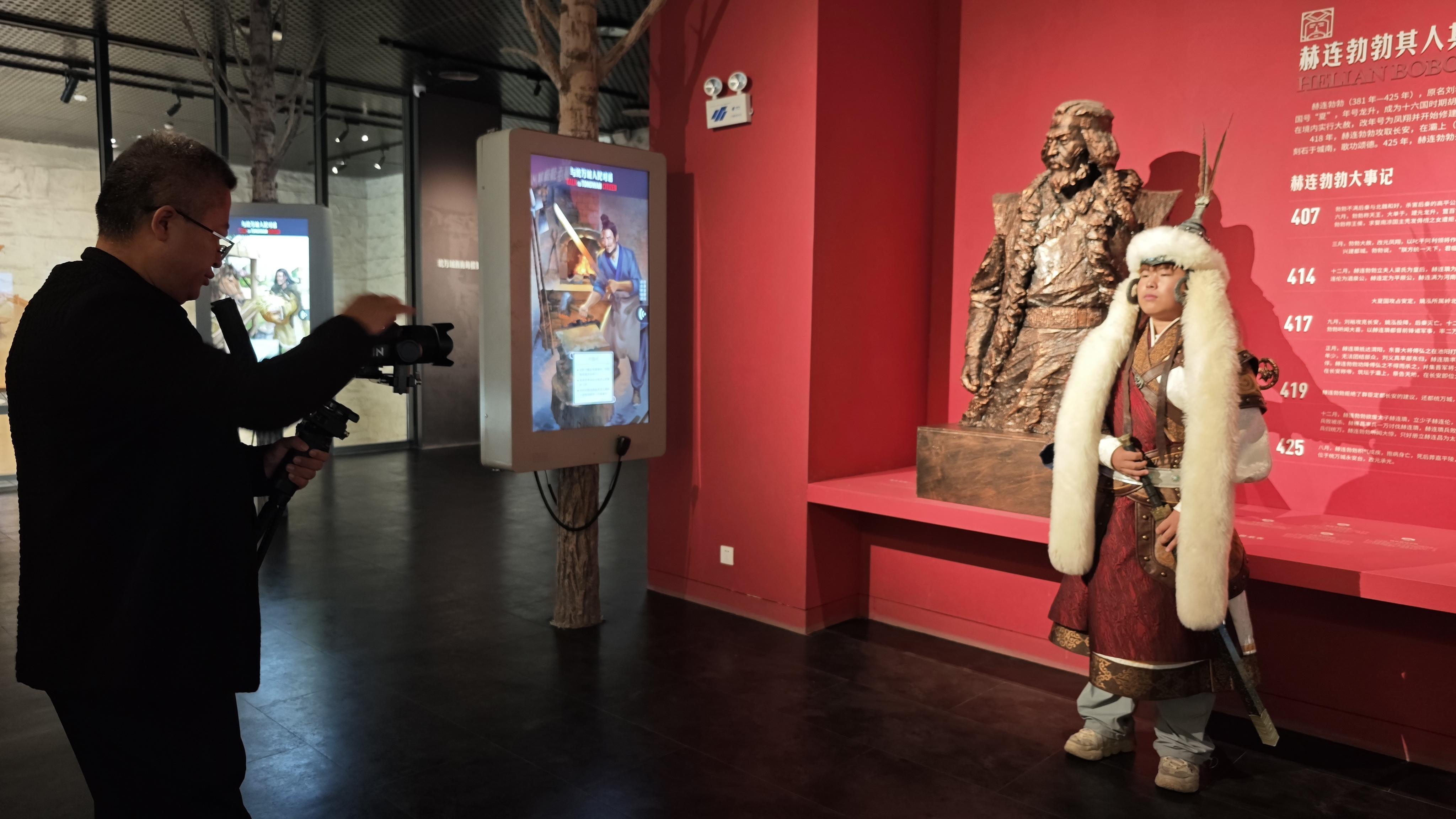 馆内的蔡文姬、霍去病、赫连勃勃等演员的沉浸式演艺,更让历史有了“温度”。身着古装的演员在复原模型前演绎赫连勃勃建城的传奇,秋风拂动衣袂,仿佛将千年故事娓娓道来,游客穿行其间,宛如随秋风穿越时空,与历史人物隔空对话。非遗展演同样营造出扑面而来的浓厚氛围:陕北说书传承人怀抱三弦,琴声伴着秋风传向远方,弹唱古今变迁;陕北民歌歌手以高亢嗓音演绎黄土风情,歌声与风声交织,满是质朴热情。不少家庭还参与了“我爱祖国”专题打卡,国风潮流在爱国歌曲中绽放别样光彩。来自广东珠海的吴兰感慨:“统万城的风里都带着历史的味道,青铜器展让人读懂文明,非遗表演让人爱上这片土地,这样的国庆体验太特别了!”