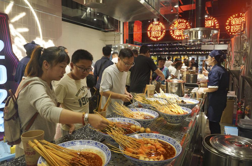 10月3日,游客在河北省唐山市唐山宴美食街品尝小吃。新华社发(梁志强 摄)