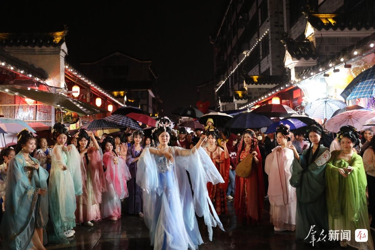 双节期间,石泉县精心策划了140余场文旅活动,覆盖古城老街、秦巴风情园、图书馆、博物馆等多个场景。汉江石泉古城作为核心打卡地,“秦巴老街十美秀”实景剧成为绝对“流量密码”。这场沉浸式行进演出以汉江为幕、老街为舞台,从《双龙开城・盛世华章》序章,到《烟火石泉・岁月流金》《绿水青山・美美与共》《国潮澎湃・青春当燃》三大篇章,再到《祝福祖国・十美同辉》终章,舞龙舞狮、将军迎宾、商贩叫卖、旗袍秀等场景轮番登场,《朱鹮的家》《汉江船夫曲》等歌舞融合山水人文之美,最终全场齐唱《歌唱祖国》《美丽中国》,激昂旋律与雨中灯火交织,成为游客难忘的记忆。