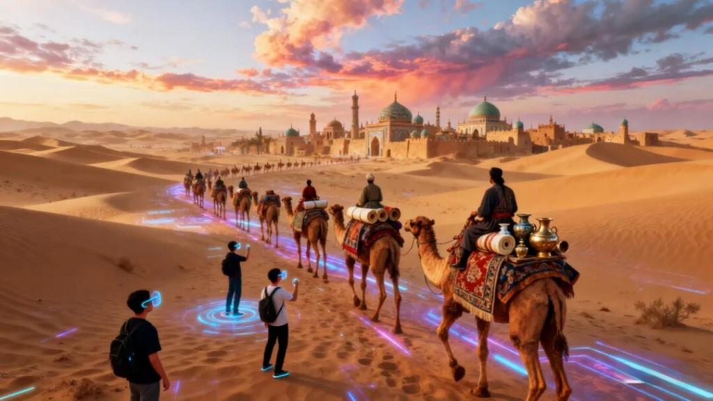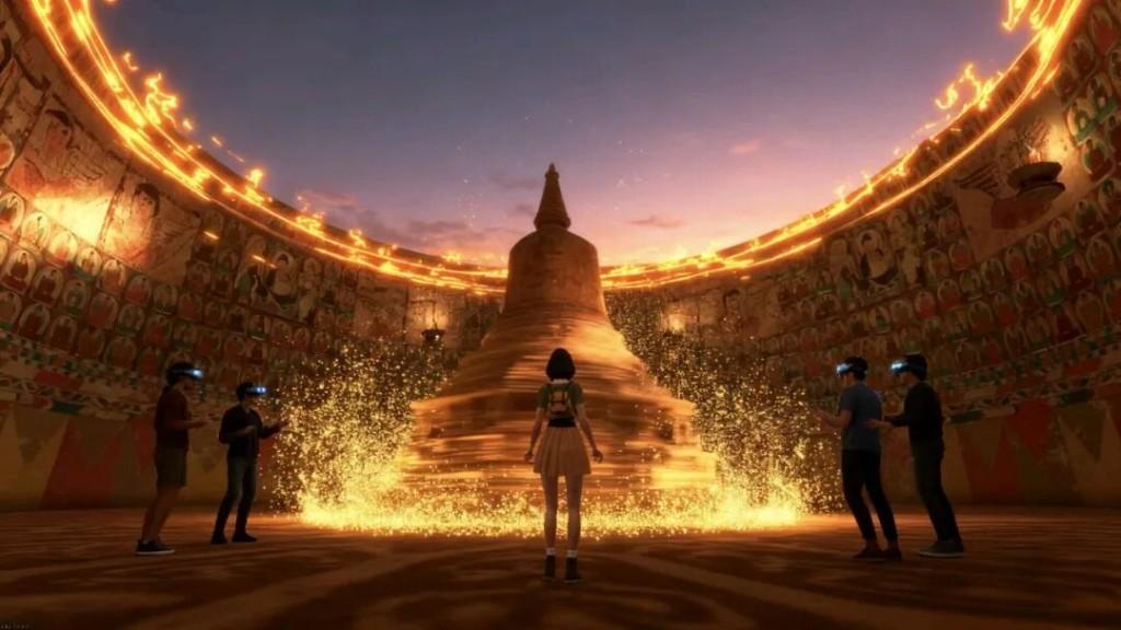 在大唐西市,假期期间前来体验“丝路灵境”XR沉浸空间的市民游客络绎不绝——在数字技术构建的世界中,敦煌壁画里的飞天“动”了起来,尘封的丝路古道再现了悠扬的驼铃声……体验者只需要跟随数字设备发出的指引,便可亲身解锁“穿越历史 玩转未来”的沉浸式文旅新体验。