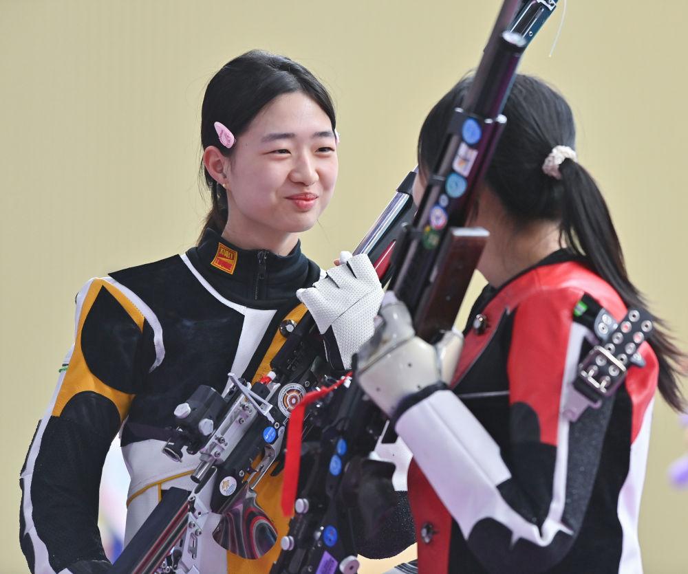 10月14日,浙江队选手黄雨婷(左)与队友王子菲在第十五届全运会女子10米气步枪团体决赛后。新华社记者 肖恩楠 摄