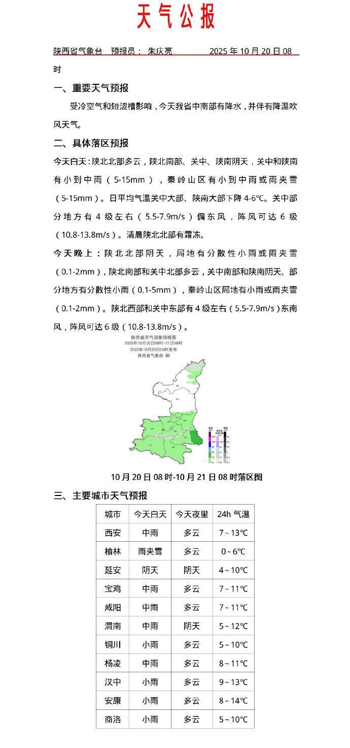 受冷空气和短波槽影响,今天陕西省中南部有降水,并伴有降温吹风天气。