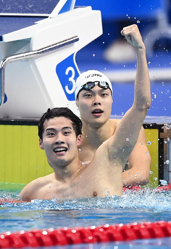 2023年9月27日,韩国选手黄宣优(前)在杭州亚运会游泳项目男子200米自由泳决赛后庆祝夺冠。新华社记者 黄宗治 摄
