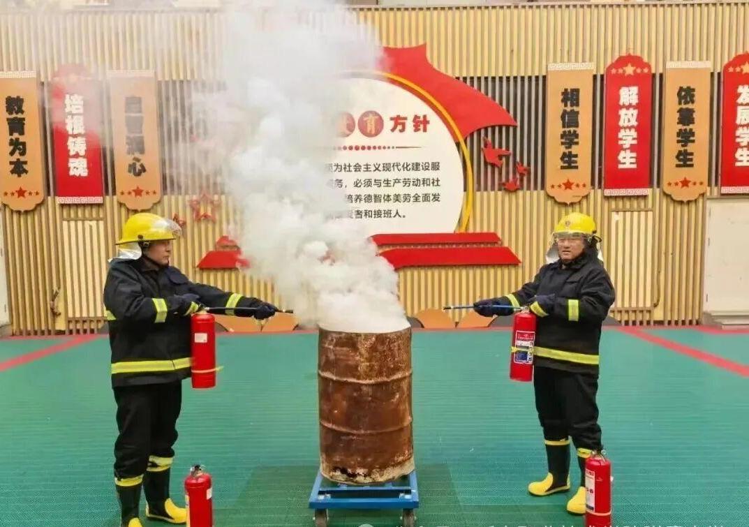 演练中,消防员现场演示了灭火器的正确使用方法。消防员详细讲解了火灾初期的扑救要点,强调“提、拔、握、压”的操作步骤,并邀请学生代表近距离观摩。通过实操演示,师生们直观了解了灭火器材的使用技巧,增强了消防安全实践能力。