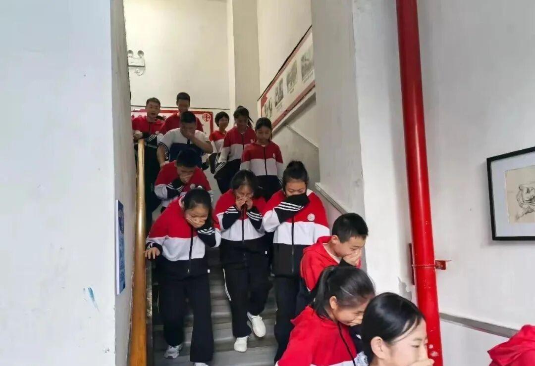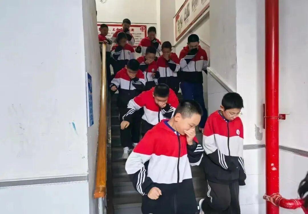 演练开始信号发出后,各班级学生在老师指引下,迅速采取防护措施。学生们用衣物或手帕捂住口鼻,弯腰低姿,沿指定路线快速向操场疏散。在楼梯间,学生们保持单列行进,不推挤、不喧哗,展现出良好的疏散秩序。