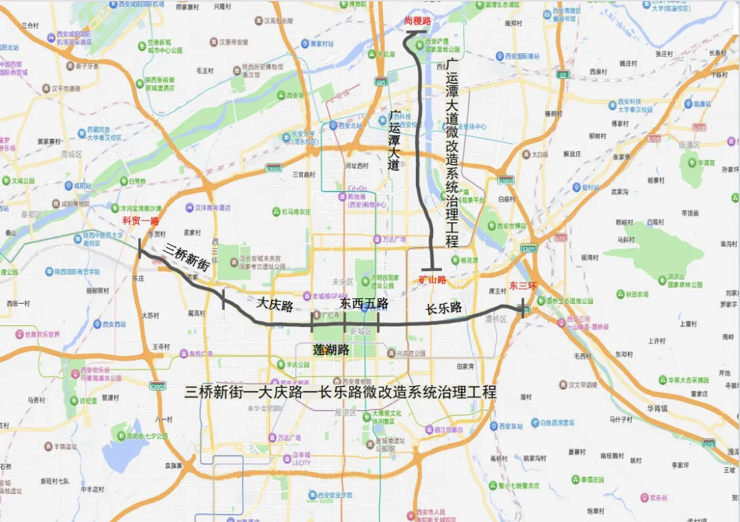 1.三桥新街—大庆路—长乐路微改造系统治理工程,西起西绕城高速,东至东三环,全长约25.4km,涉及西咸、莲湖、新城、浐灞国际港、灞桥五个区域;主要建设内容包括:道路工程、管线工程、交通工程、照明工程、绿化工程、桥梁工程。