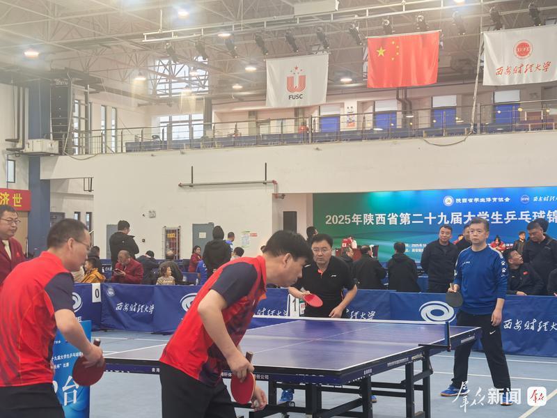 10月25日至26日,在2025年陕西省第29届大学生乒乓球锦标赛暨“校长杯”比赛现场,来自陕西财经职业技术学院的两名副书记朱华斌和殷兴光并肩作战,在全省近百名高校领导组成的参赛队伍中突围,最终斩获乙组团体第五名。