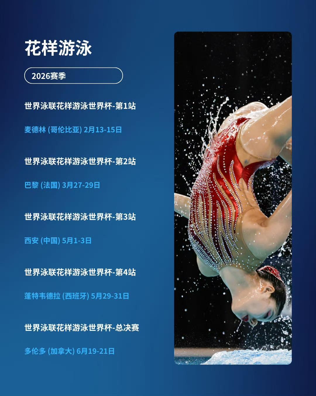 根据世界泳联官方公布的相关赛历,2026赛季该项赛事包括4个分站赛和1场总决赛,其中4个分站赛分别于2026年2月13日至15日在哥伦比亚麦德林、2026年3月27日至29日在法国巴黎、2026年5月1日至3日在中国西安以及2026年5月29日至31日在西班牙蓬特韦德拉举行,总决赛则于2026年6月19日至21日在加拿大多伦多举行。