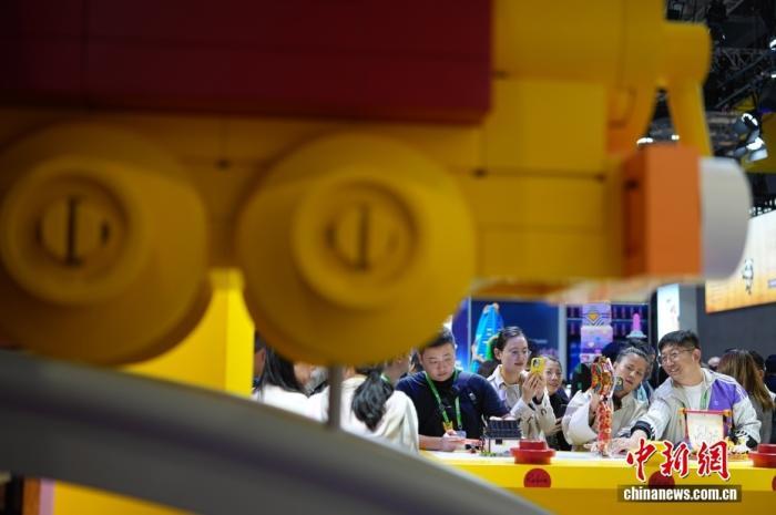 11月6日,上海,第八届中国国际进口博览会消费品展区人气旺。图为乐高展台吸引参观者。中新社记者 蒋启明 摄
