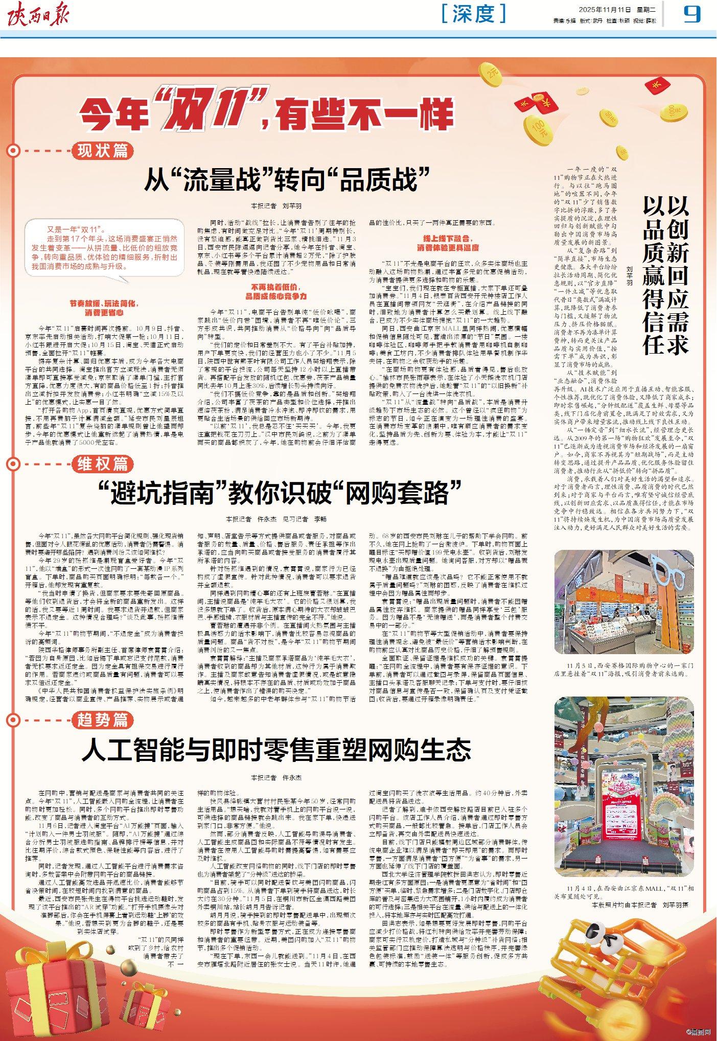 同时,活动“战线”拉长,让消费者告别了往年的抢购焦虑,有时间做充足对比。“今年‘双11’周期特别长,没有紧迫感,能真正做到货比三家、精挑细选。”11月3日,西安市民陈逗逗向记者分享,她今年在抖音、淘宝、京东、小红书等多个平台累计消费超2万元,“除了护肤品、冬装等刚需用品,我还囤了不少宠物用品和日常消耗品,现在就等着快递陆续送达。”
