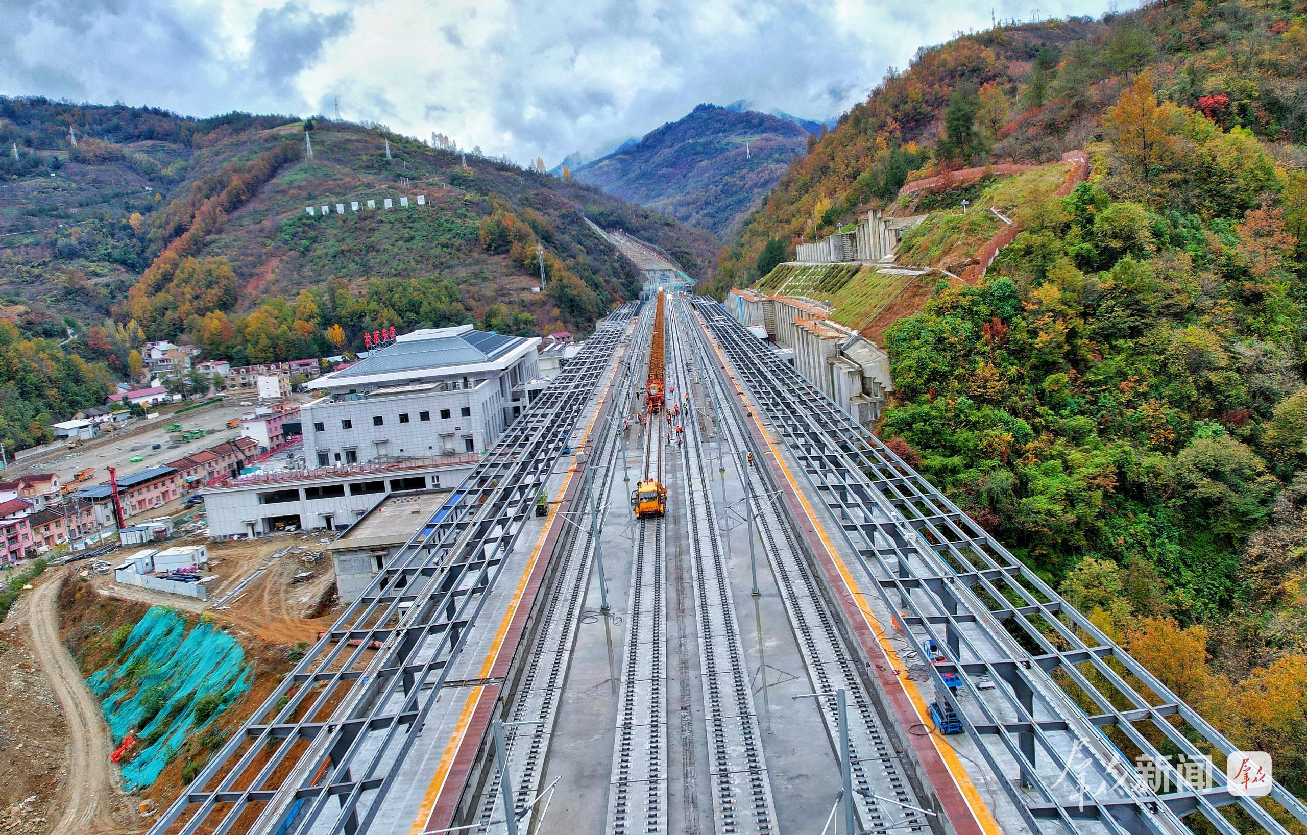 中铁一局、中铁十一局的建设者们冒雨作业,随着最后一对500米长钢轨平稳铺设到位,西康高铁轨道成功延伸至镇安西站,标志着项目铺轨工程取得阶段性突破。