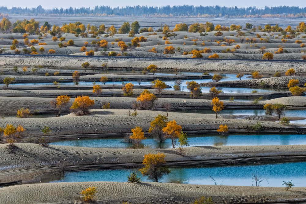 在新疆和田地区和田县翡翠湖,成片胡杨林坐落其中(无人机照片,10月20日摄)。新华社记者 辛悦卫 摄