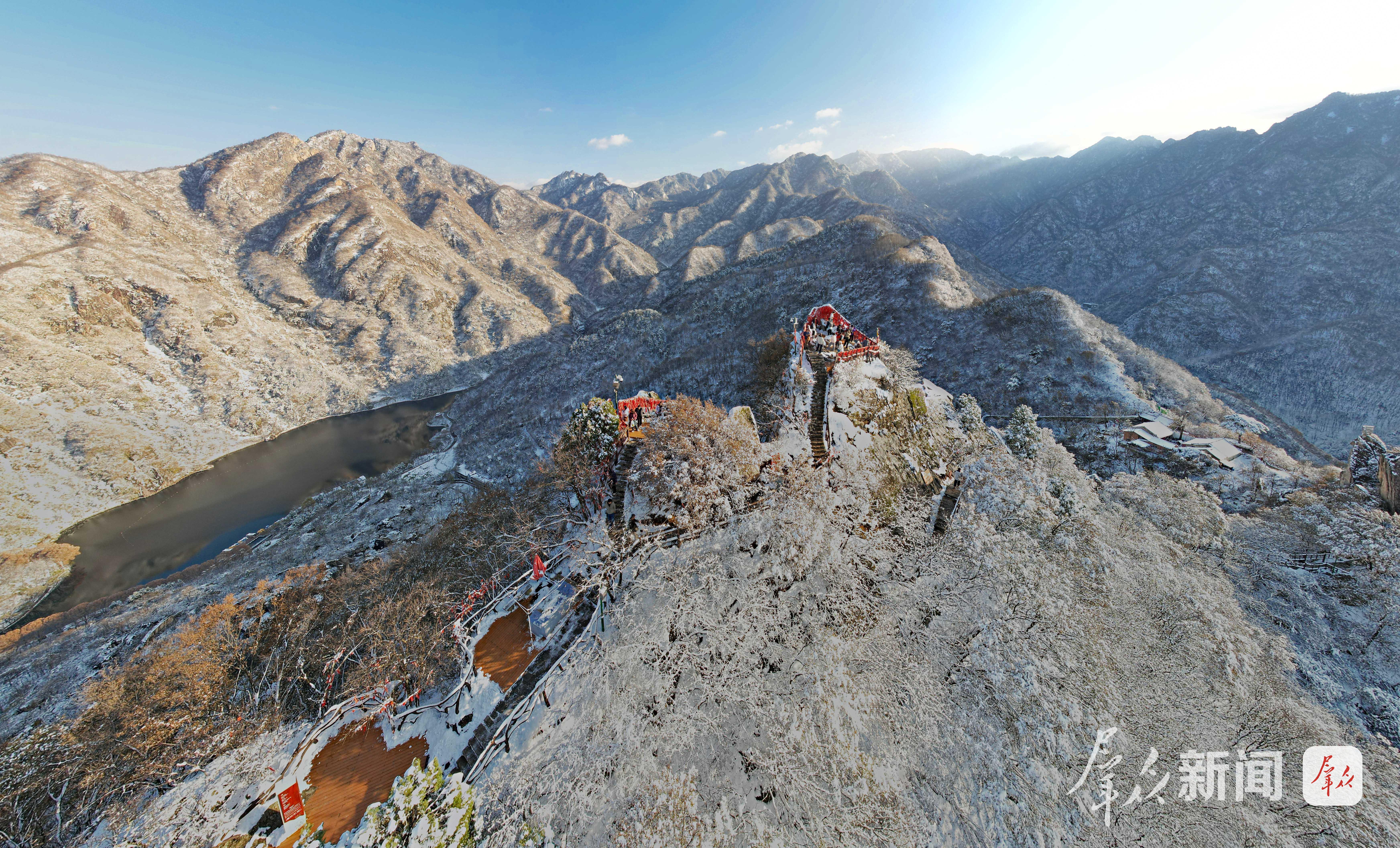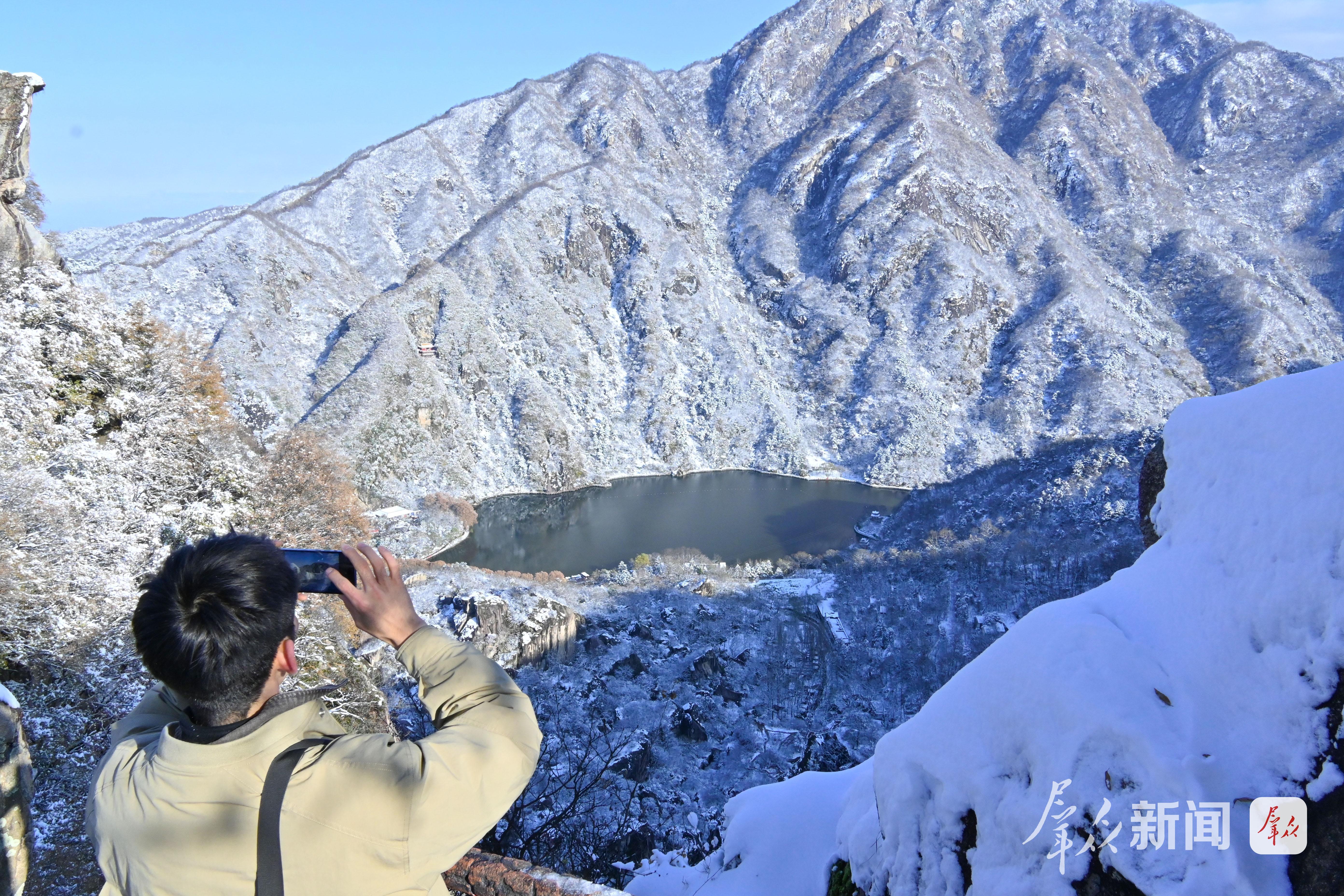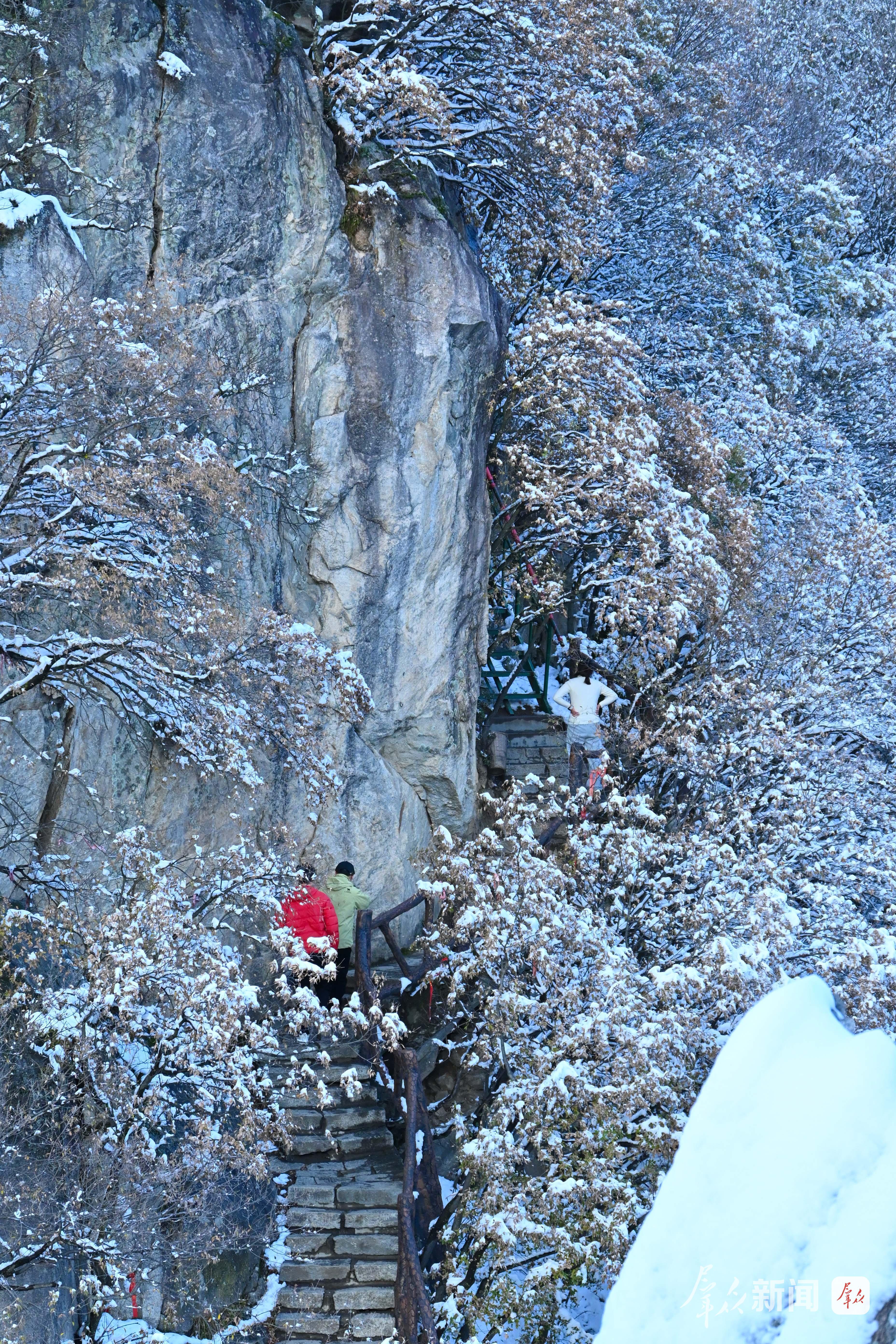 秦岭迎来初冬第一场雪。11月17日,西安翠华山景区内,游人漫步于银装素裹的静谧山间,宛若置身一幅徐徐展开的水墨画卷,尽显中式美学意境。(群众新闻记者 杜玮)