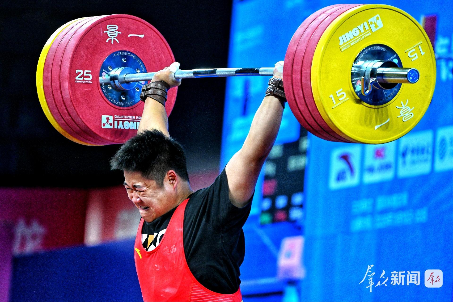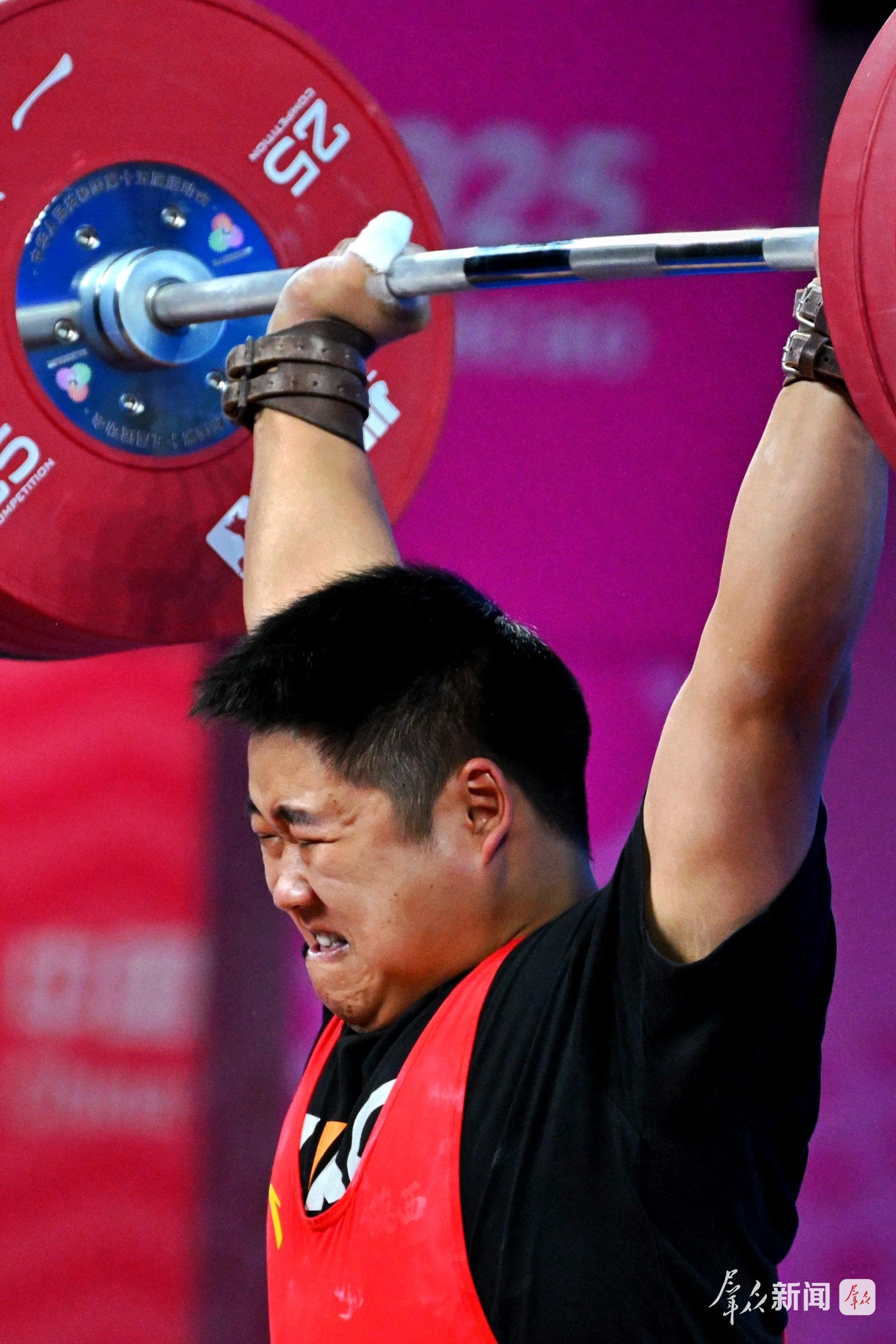 挺举比赛战况更为激烈,选手们纷纷向更高重量杠铃发起冲击。刘欣欣首次试举选择200公斤,动作一气呵成,杠铃稳稳停在头上。第二次试举,他选择挑战203公斤,技术动作走形,试举失败。