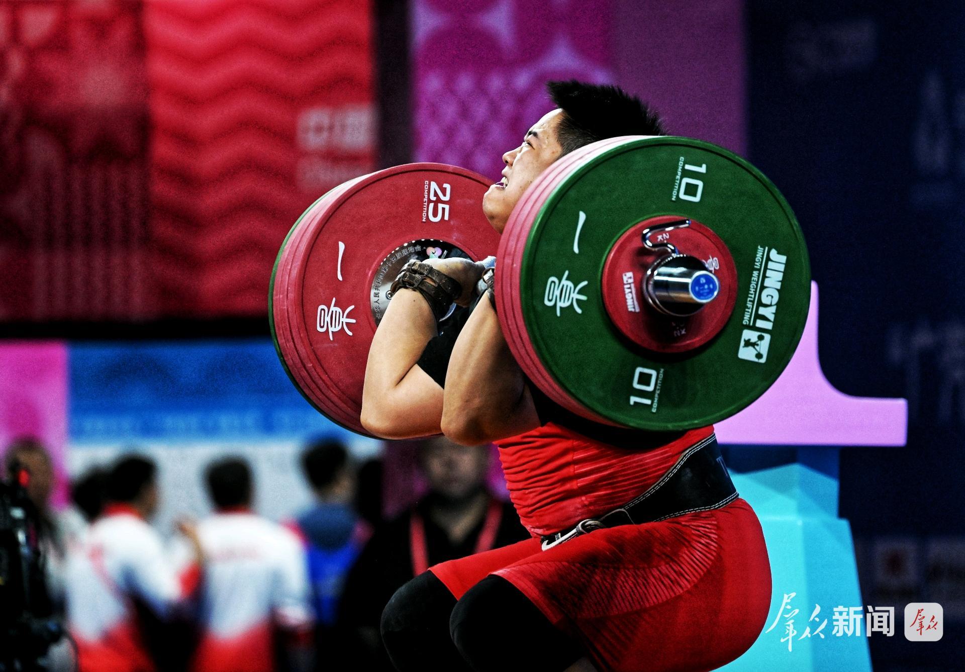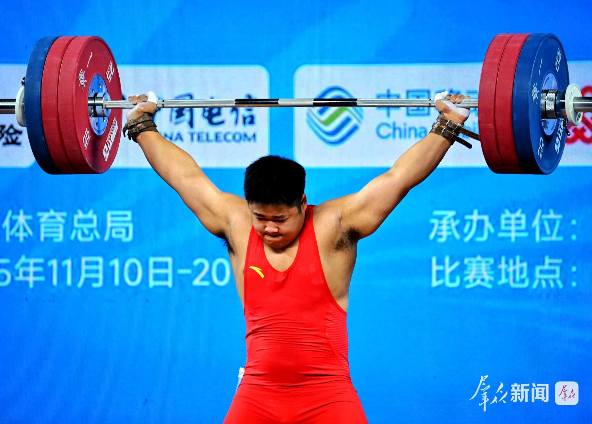 11月19日,第十五届全国运动会男子举重96公斤级决赛在广东东莞举行。陕西运动员刘欣欣举起371公斤的总成绩,摘得铜牌。