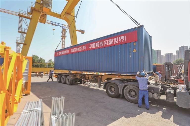 今年6月13日,在陕建机股份泾渭工业园,工人把即将发往俄罗斯的塔机产品结构件装入集装箱(资料照片)。 受访单位供图