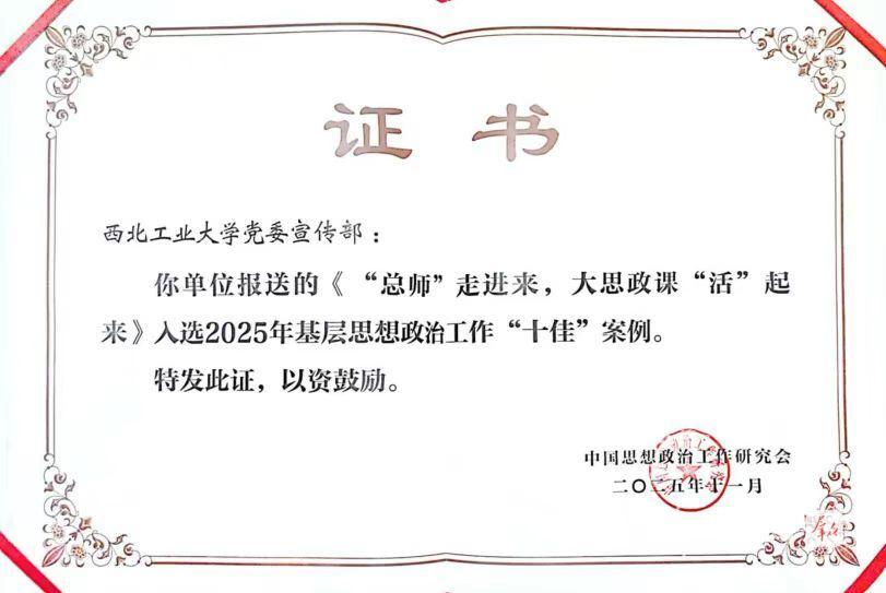 11月21日,中国思想政治工作研究会(简称“中国政研会”)首次举办的基层思想政治工作创新经验交流展示活动公布了2025年基层思想政治工作“十佳”案例和创新案例名单,我省政研会推荐的西北工业大学创新案例《“总师”走进来,大思政课“活”起来》入选2025年基层思想政治工作“十佳”案例。