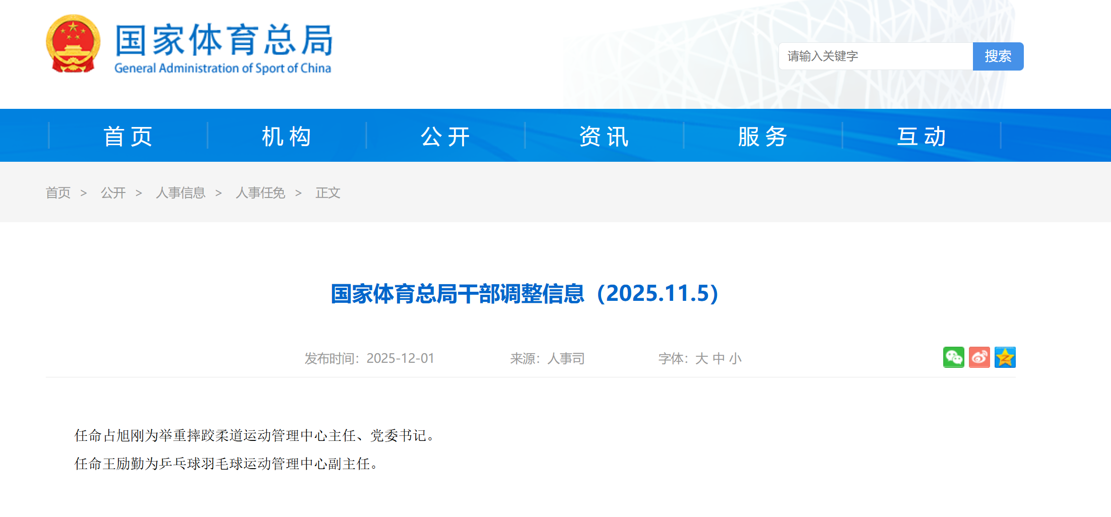 国家体育总局发布干部调整信息