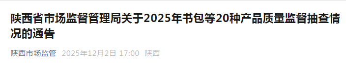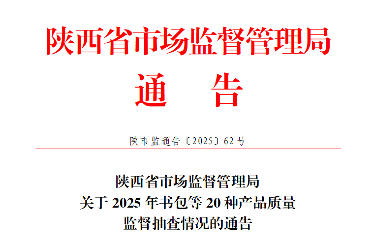 近期,陕西省市场监督管理局组织开展了书包等20种产品质量监督抽查,现将抽查情况通告如下。