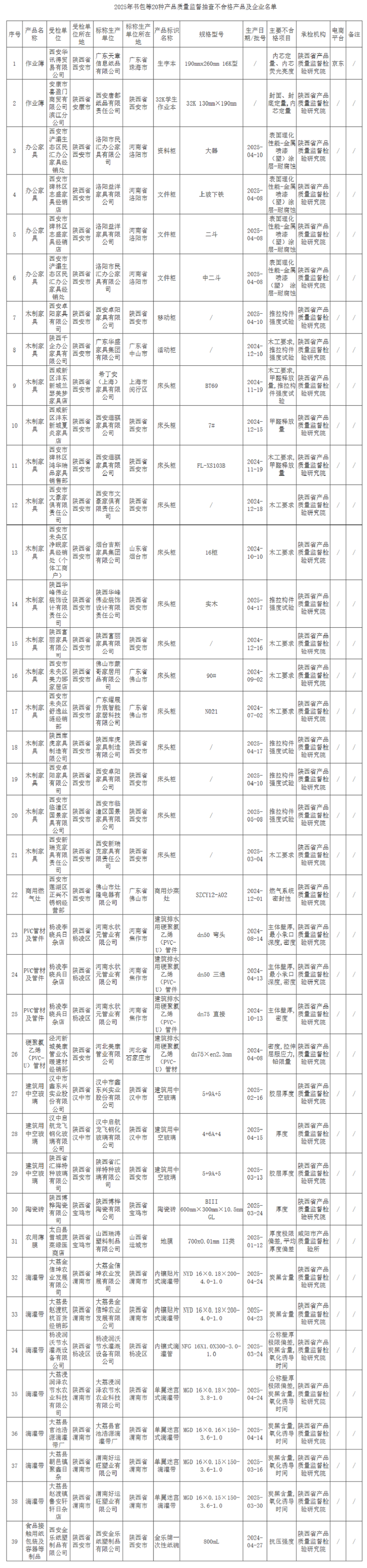 (一)监督抽查概况。本次抽查产品为笔、书包、作业簿、办公家具、木制家具、商用燃气灶、纸尿裤(片、垫)、PVC管材及管件、建筑用绝缘电工套管、无规共聚聚丙烯(PP-R)管材、硬聚氯乙烯(PVC-U)管材、建筑用中空玻璃、陶瓷砖、农用薄膜、钾肥、滴灌带、食品接触用纸包装及容器等制品、耐热聚乙烯(PE-RT)管材、可重复使用的塑料餐饮具、月饼过度包装等20种产品。共抽查检验了436家企业生产、销售的898批次产品,发现不合格产品39批次,包括作业簿2批次、办公家具4批次、木制家具15批次、商用燃气灶1批次、PVC管材及管件3批次、硬聚氯乙烯(PVC-U)管材1批次、建筑用中空玻璃3批次、陶瓷砖1批次、农用薄膜1批次、滴灌带7批次、食品接触用纸包装及容器等制品1批次。