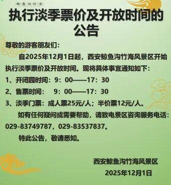 自2025年12月1日起,西安秦岭野生动物园开始执行淡季票价及开放时间。现将具体事宜通知如下: