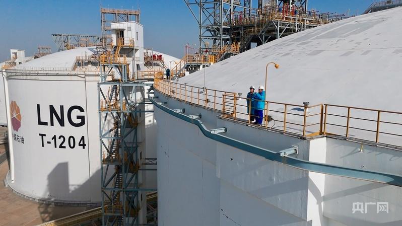 记者和采访对象站在20万立方米的LNG储罐上(央广网记者 杨梦奎 摄)