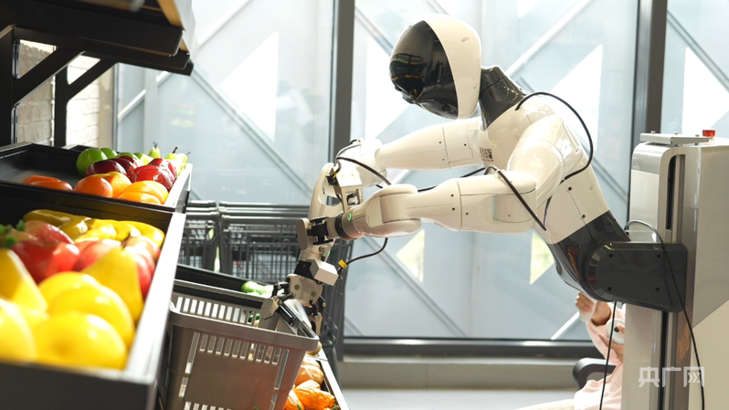 人形机器人在超市零售场景应用训练(央广网记者邓子依 摄)
