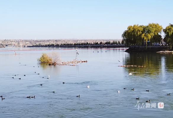 日前,记者在王家崖水库和千渭之会国家湿地公园看到,冬日暖阳下,多种鸟类在此栖息,它们或贴近水面飞翔,或驻足停留捕食,或在水面游弋嬉戏。一些专门来此拍照的市民纷纷举起相机,用镜头定格这美好的景象。